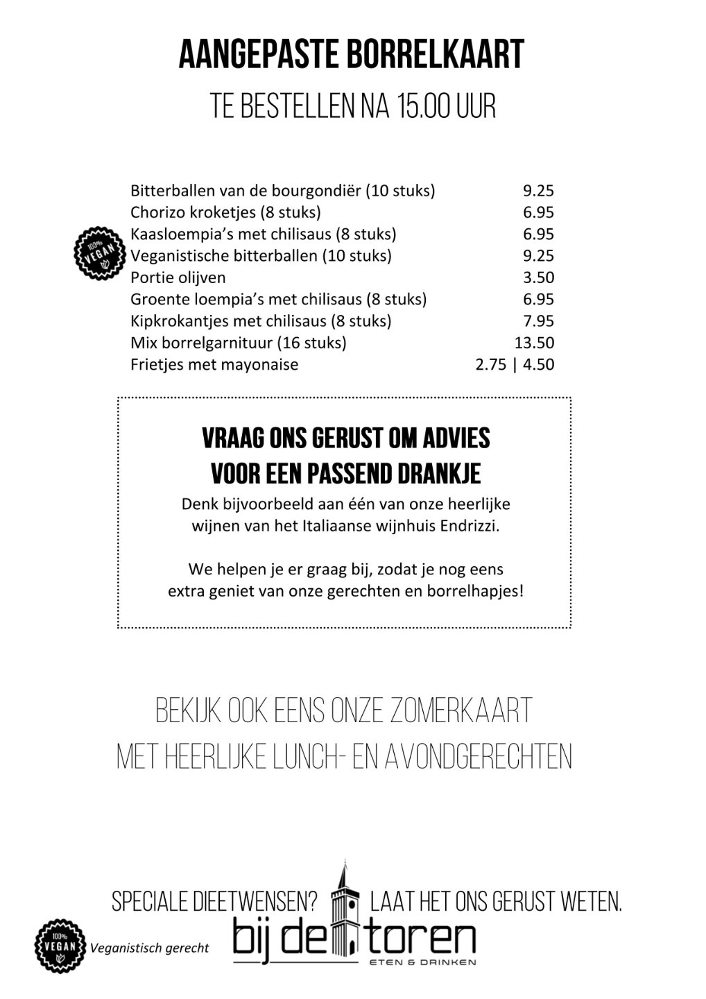 Genieten van onze heerlijke borrelhapjes. Gezellig aan een tafeltje binnen of als het mooi weer is op ons buitenterras. Bekijk hieronder onze borrelkaart voor deze zomer en vraag ons gerust naar een passend drankje.