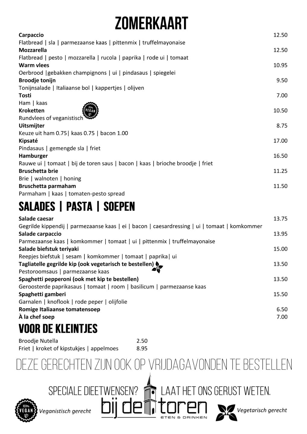 Hieronder vind je onze Zomerkaart met diverse gerechten. Heerlijk lunchen of op de vrijdagavonden. Genoeg keuze: van vegetarische gerechten tot Italiaanse pasta's. Gezellig aan een tafeltje binnen of als het mooi weer is op ons buitenterras. Vraag ons trouwens gerust naar een passend drankje voor bij jouw gerecht.